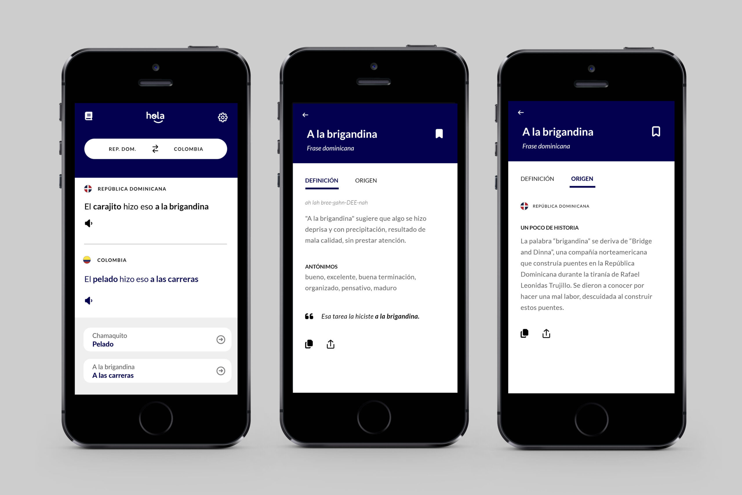 Hola is a mobile app concept designed to bridge communication gaps among Spanish speakers. The app translates phrases and expressions between different Hispanic dialects, helping users communicate better across countries.